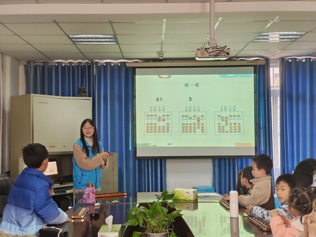 志愿者赵艳同学首先以猜谜语的方式引发小朋友们的兴趣,最后引出我们的主角——算盘,通过对算盘的由来及构成做出介绍,让小朋友们对中国古代理财工具有了初步的认识,然后志愿者将算盘拿给小朋友们亲身体验,并对如何认数、如何计数做了进一步的讲解。
