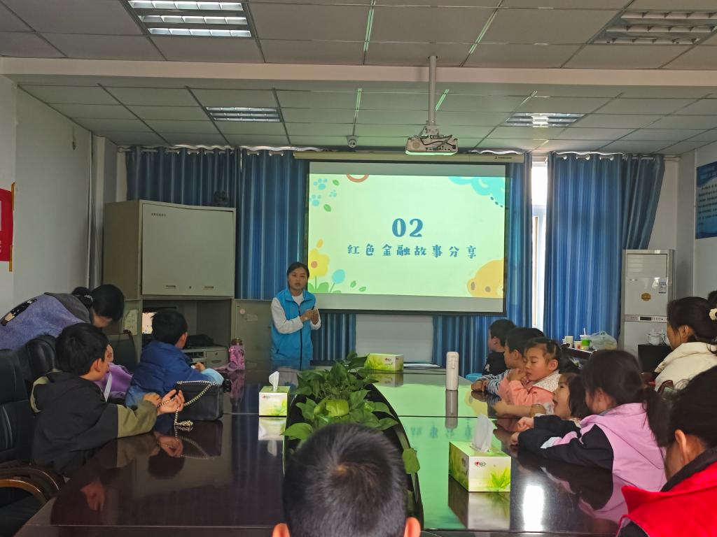 为延续和传承爱国精神,以及倡导勤俭节约的好习惯,志愿者胡竞予同学向小朋友们分享了红色金融故事——“扁担上的银行”,结合革命先辈们爬雪山、过草地的图片等等,号召小朋友们学习先辈优良品德,争做新时代好少年。
