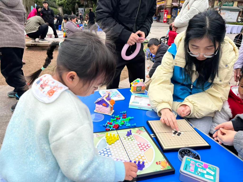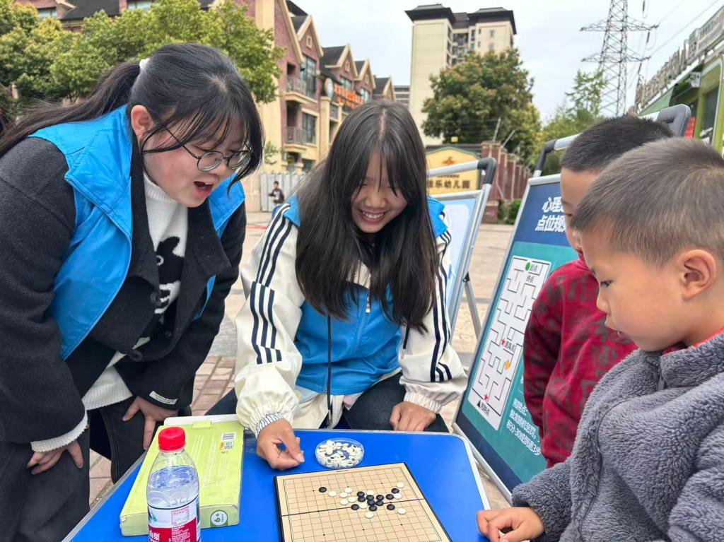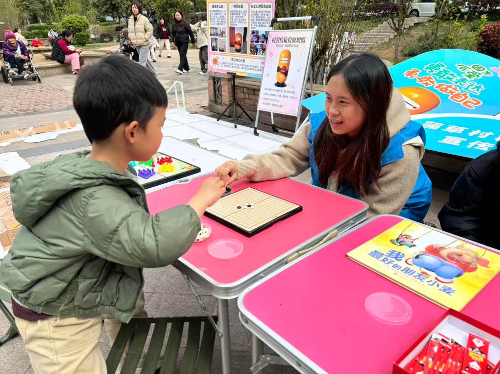 五子棋对弈环节则掀起了现场的互动热潮,孩子们踊跃参与、两两对弈。棋盘前,孩子们认真思考、谨慎落子,志愿者在旁适时给予思路指导,现场既充满着棋艺切磋的竞技趣味,又洋溢着轻松欢乐的互动氛围。这一环节不仅让孩子们在对弈中锻炼了逻辑思维能力与专注力,更培养了他们胜不骄、败不馁的良好心态和规则意识。