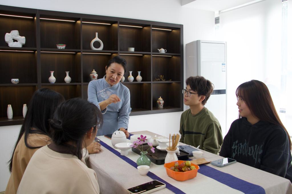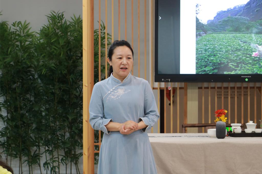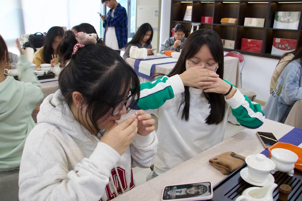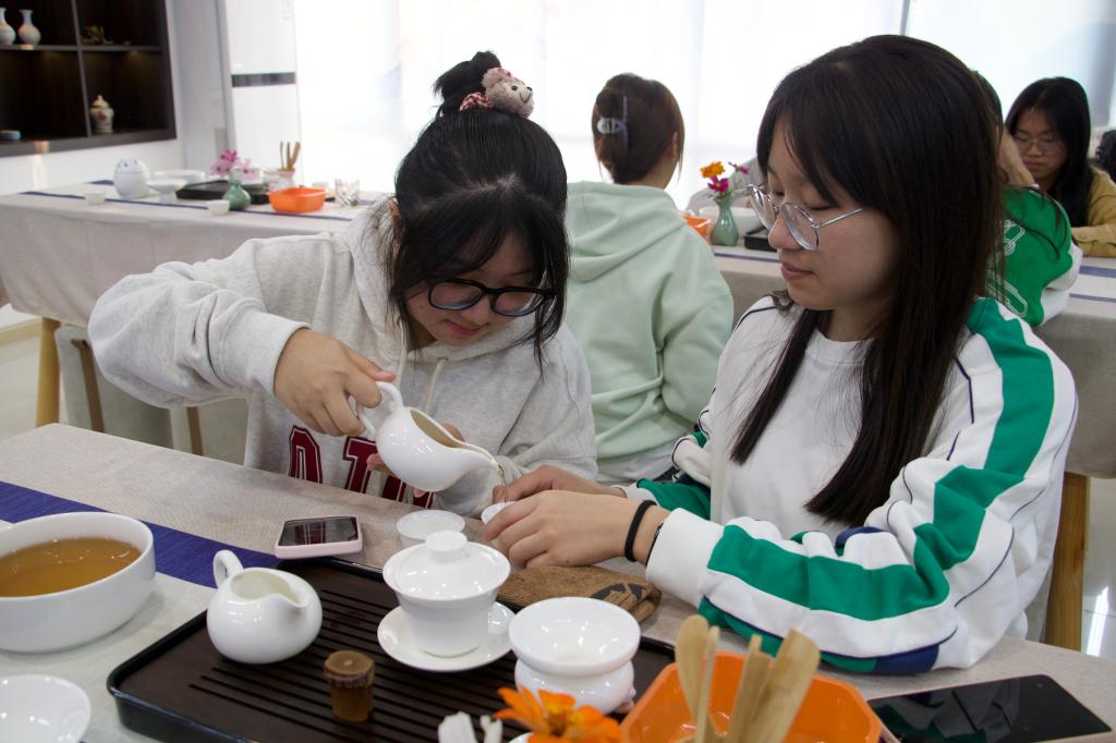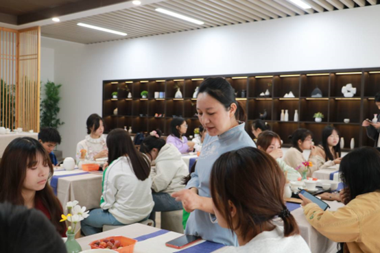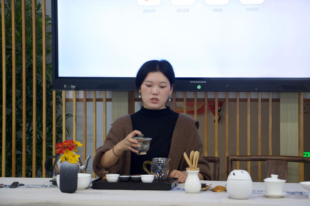 活动现场气氛热烈,同学们互相交流学习,主动举手提问,积极向老师请教学习,庞老师也逐一为同学们答疑解惑。热茶泡好后,老师教授同学们品茶的礼仪——左手持杯以为礼,右手持杯以为敬。在学茶、品茶、论茶的过程中,同学们领略到茶道艺术的无穷魅力。