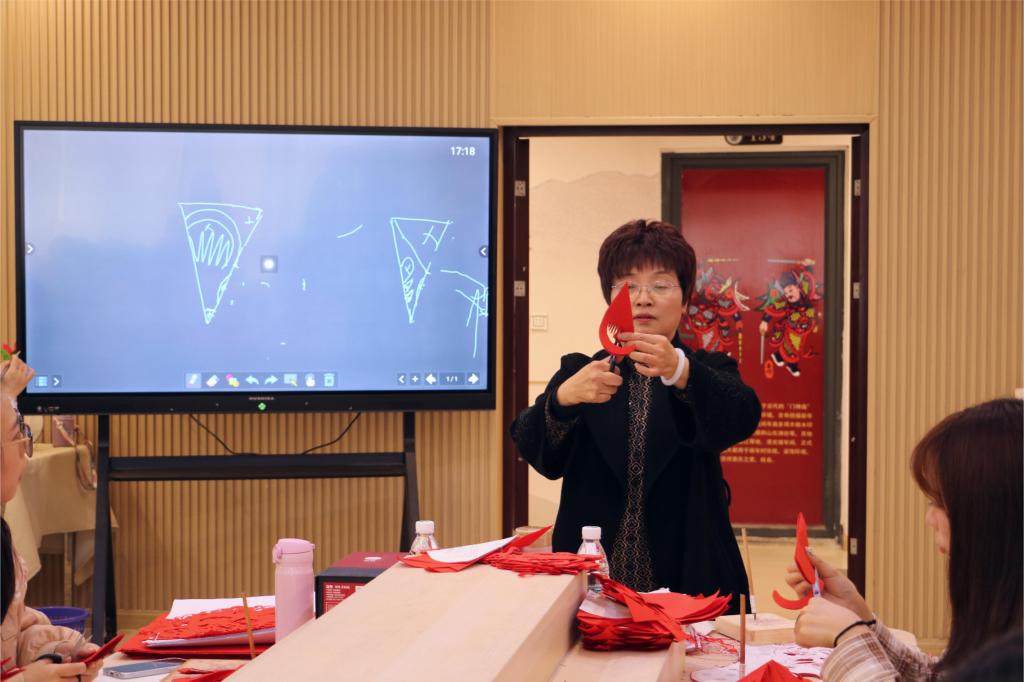 随后,高老师现场演示了剪纸的基本技巧,一张张普通的红纸在她的巧手下逐渐变成了一幅幅精美的剪纸艺术作品。同学们纷纷围观,惊叹不已。高老师分了四个具体步骤向同学们详细的展示和说明剪纸的实操方法。