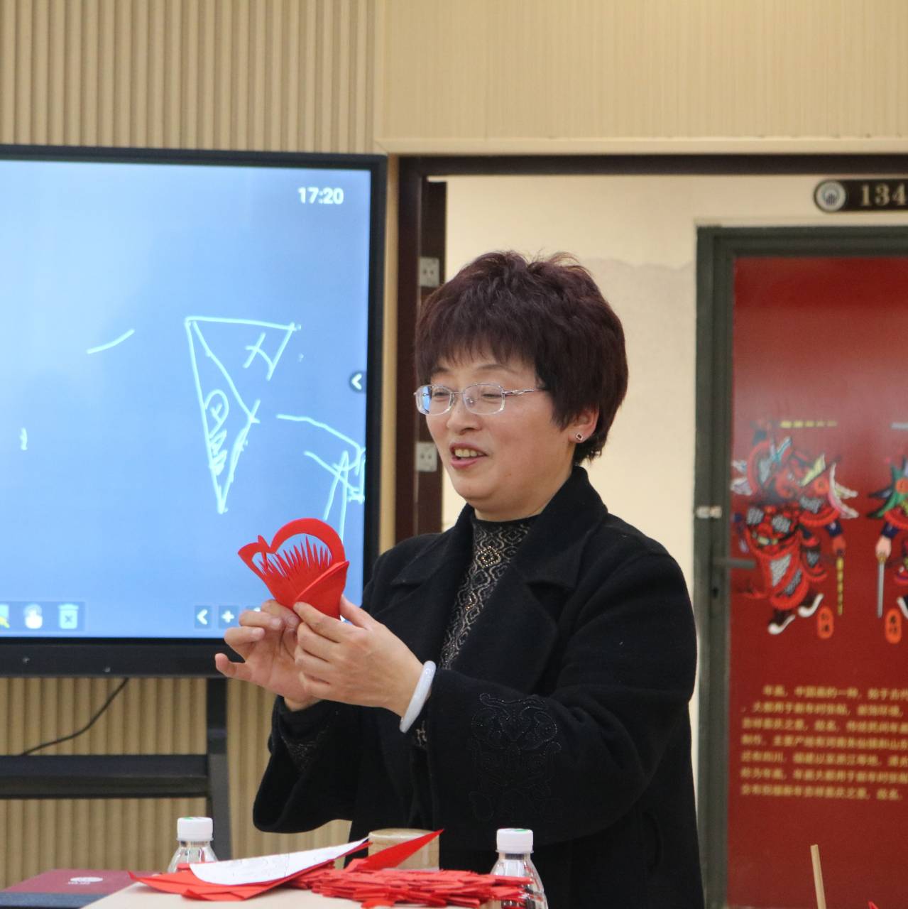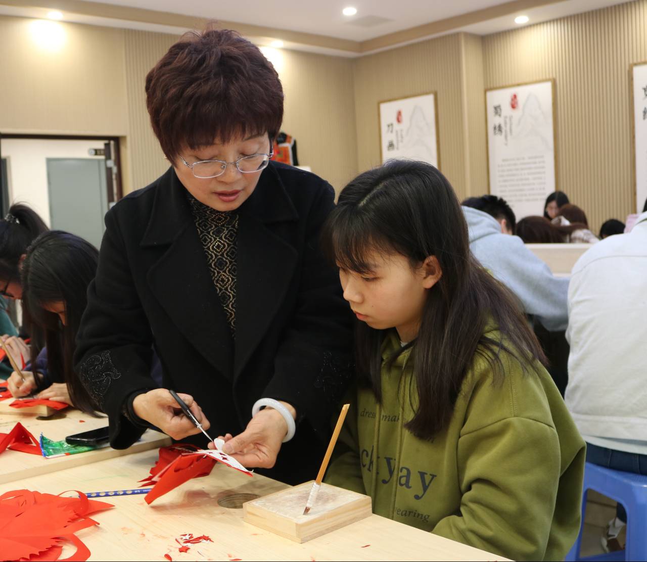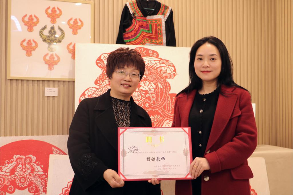 团委现聘高老师为我校非遗中心“魅力非遗”课程授课教师。在活动现场,高慧兰老师为近50名同学带来了一堂生动的剪纸课。高老师首先介绍了剪纸的起源、发展及艺术特点,让同学们对剪纸有了初步的了解。