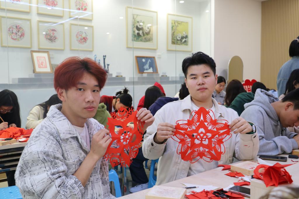 同学们兴奋地展示自己的作品,有着五角星、玫瑰花等许多剪纸图案,他们互相交流学习心得,现场气氛热烈而欢快。通过亲手制作剪纸作品,同学们纷纷表示,本次活动不仅感受到了传统文化的魅力,对剪纸这一非遗技艺有了更深刻的认识,还锻炼了自己的动手能力,培养了自己耐心和细心的品质,同时也激发了自身对传统文化的兴趣和热爱。