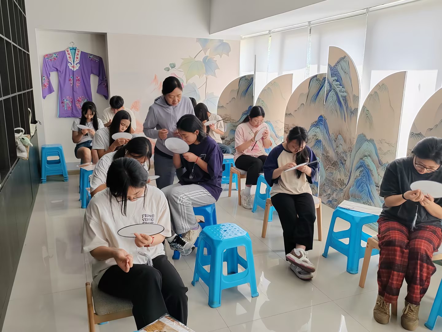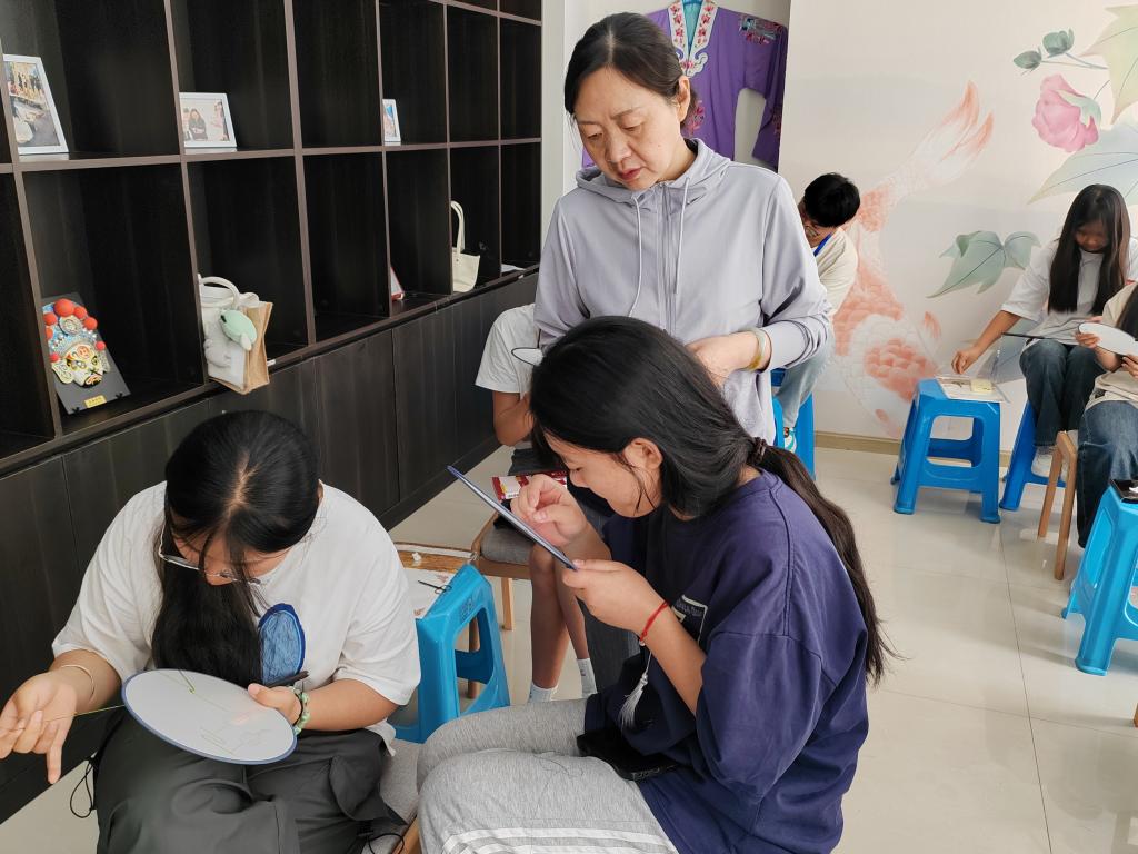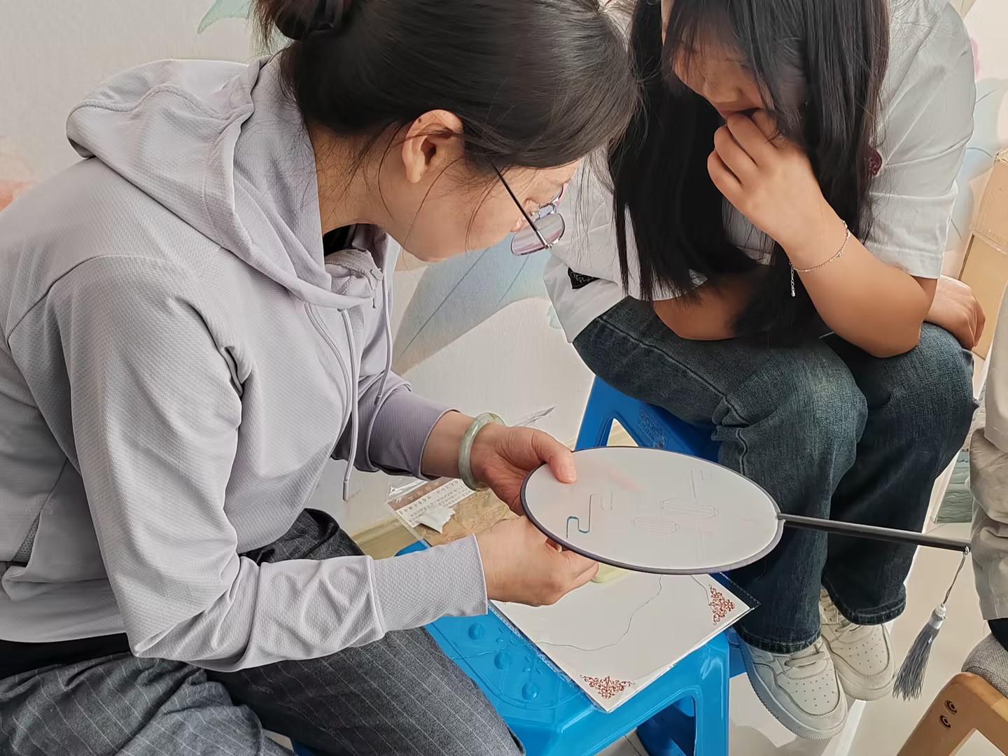在老师耐心细致的指导下,同学们纷纷在绣布上开始刺绣实践。他们专心致志、不急不躁地开始穿针走线,绣出专属于自己的蜀绣作品。