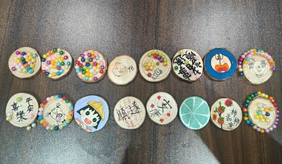 完成草图后,同学们开始调配色彩 、粘贴装饰。大家相互交流色彩搭配技巧,分享装饰材料使用心得。现场气氛热烈,不时传出惊叹与欢笑。经过一个多小时的精心制作,一片片普通木片摇身一变,成为色彩斑斓、风格各异的精美挂件。