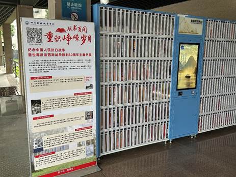自助借还书柜位于教学楼B栋门口,它以智能化服务打破空间与时间限制,师生可随时前往借阅。书柜旁的主题展架清晰呈现书籍亮点,方便师生快速定位兴趣读物。从校园角落的自助借还设备到丰富的抗战主题藏书,图书馆(档案馆)将红色文化传播嵌入师生日常学习生活场景,让大家在书页翻阅间,重识那段峥嵘岁月,聆听历史的深刻回响,在知史明志中厚植家国情怀。