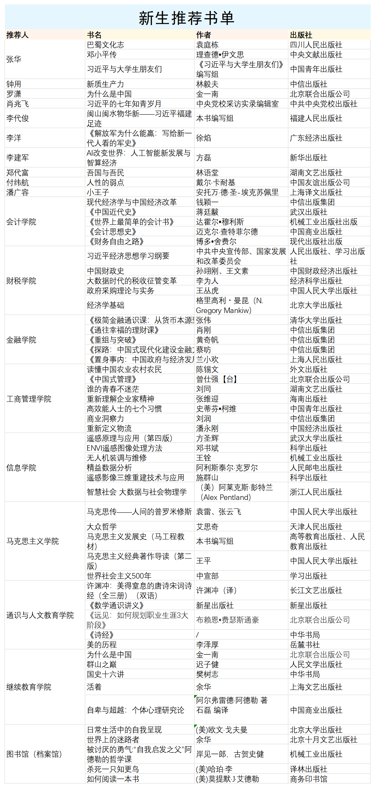 为引导新生开启大学阅读之旅,由院领导、二级学院、图书馆(档案馆)、教师代表精心推荐并推出收录60册图书的《新生推荐书单》,为新生提供权威阅读指引。