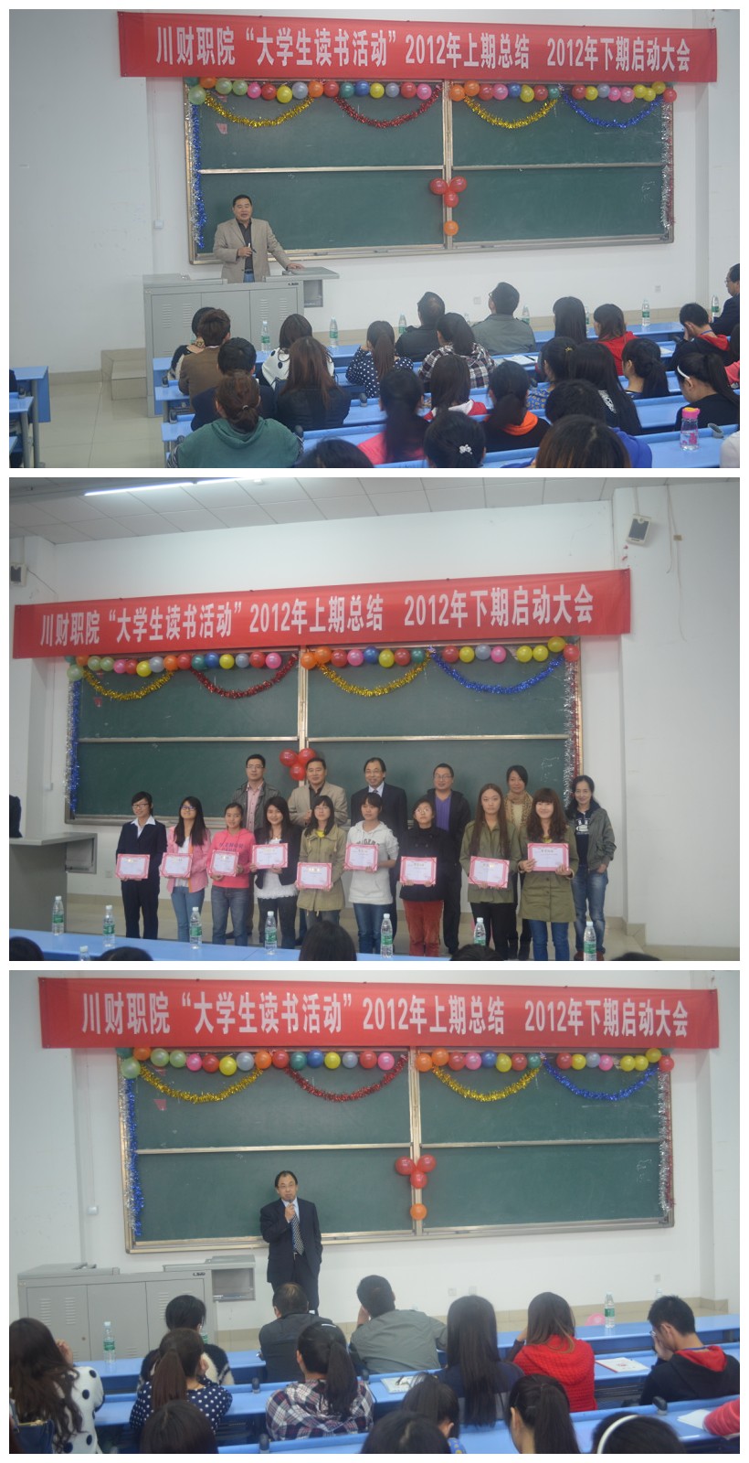 读者协会副会长张蕾同学对上期大学生读书活动进行了总结,宣布了在上期“读书月活动”征文比赛中获奖同学名单。到会的有关领导和老师为获奖同学颁奖并合影留念。