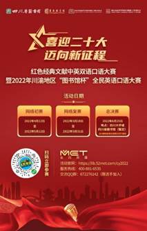 2022年是党的二十大召开之年。为营造喜迎盛会的良好氛围,号召川渝地区各界人民主动深刻理解、体会党的十九大精神及内涵,提高荣誉感和增强凝聚力,以实际行动迎接二十大的胜利召开。四川省图书馆、重庆图书馆、四川省图书馆学会、重庆市图书馆学会、四川省普通高等学校图书情报工作指导委员会、重庆市高等学校图书情报工作委员会、四川省中心图书馆委员会办公室将于2022年4月至6月联合川渝地区各图书馆共同举办“喜迎二十大,迈向新征程”红色经典文献中英双语口语大赛暨2022年川渝地区“图书馆杯”全民英语口语大赛。