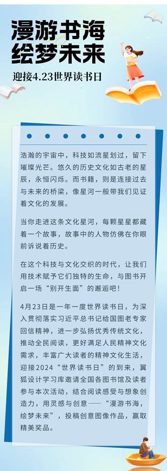 1、本次活动以“漫游书海 绘梦未来”为主题,征集关于该主题的平面创意图像作品,创作内容不限,表现手法不限,使用软件不限,包括但不限于海报设计、插画漫画、创意摄影、文创设计、IP形象设计等,参与者可自由发挥。