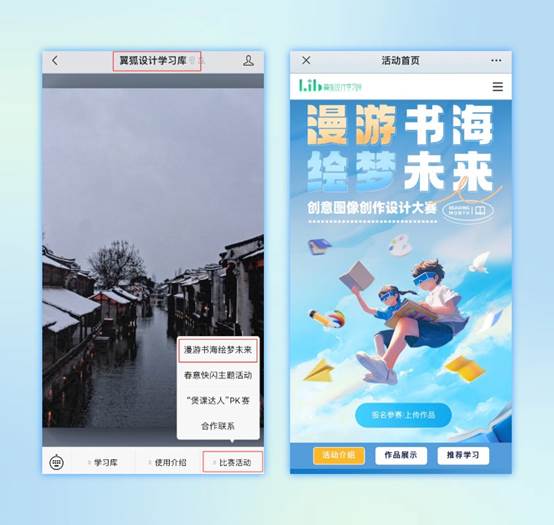 2、在“翼狐设计学习库”公众号,点击菜单栏,选择“比赛活动”-“漫游书海绘梦未来”即可进入活动页面报名参加活动。