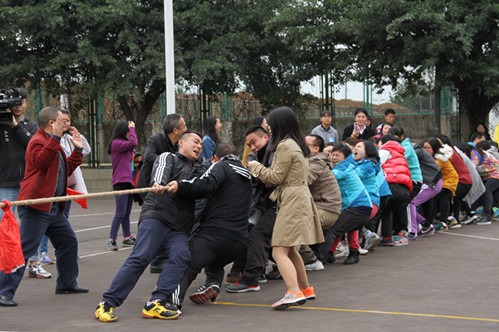 接下来,按工会小组组队参加的拔河比赛将运动会推向了第一个高潮。非参赛师生高声呐喊的加油助威声、欢笑声,胜利后的喜悦与叹息声此起彼伏,热闹非凡,整个赛场一片沸腾。经过若干轮激烈的角逐,最终由艺术体育部和工商管理系工会小组组成的参赛队力战群雄,脱颖而出,荣获冠军。点燃老师们热情的拔河比赛之后,足式保龄、袋鼠夹球、孤岛求生等六项个人比赛同时在田径场上如火如荼的展开。老师们积极参与,热情高涨,现场一片欢声雷动,喝彩声不绝……