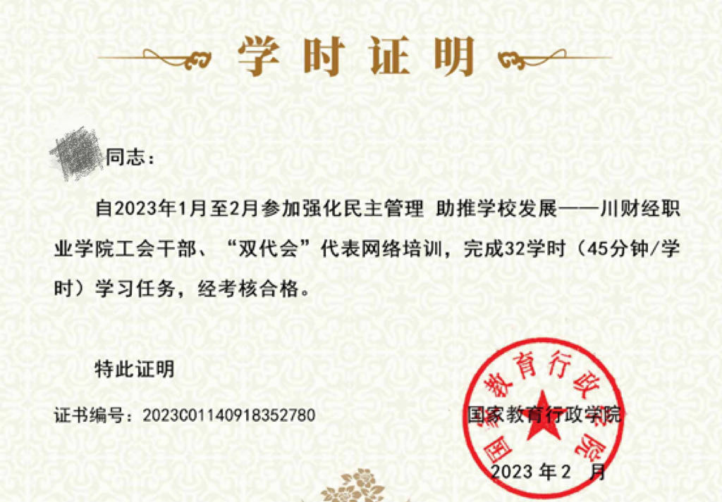 目前各位学员已按时完成全部课程,获得相关结业证书。学员们纷纷表示,本次培训通过系统学习二十大精神、《工会法》等政策,提高了自身素质和依法履职能力,激发代表的主人翁意识,要将学习成果运用到教代会实际中,为学院发展积极建言献策。