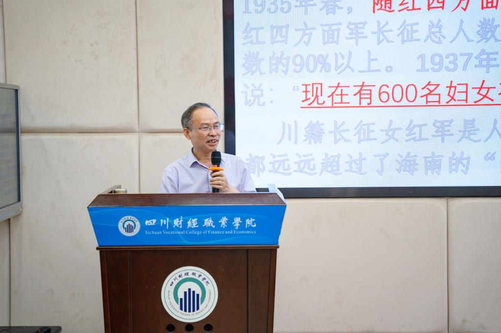 接着,学院“大思政课”师资库特聘专家、中共四川省委党校(四川行政学院、四川长征干部学院)党史教研部教授、历史学博士王友平通过“红军长征路线示意图”向大家展示了长征路途的遥远与艰辛,从长征女红军的基本情况、川籍女红军的长征历程、川籍女红军长征的重要历史贡献三个方面阐述了川籍女红军的伟大贡献和成绩。同学们更深刻感受到伟大的长征精神对她们一生的深刻影响,感受到长征赋予她们的那种独特的品格、气质与力量。