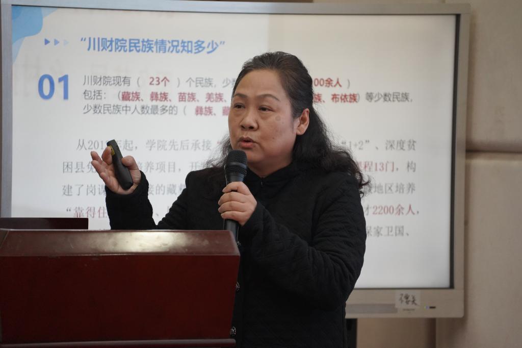本次授课以“铸牢中华民族共同体意识”为题,张华首先结合学院实际情况,详细阐述了学院在铸牢中华民族共同体意识教育工作方面的具体举措和主要成效。2023级电子商务2班的阿尔马日同学和2023级电子商务3班的杨慧洋同学作为学生代表,结合自己的学习与生活经历,分别讲述了铸牢中华民族共同体意识工作为他们带来的积极改变,深刻体会铸牢中华民族共同体意识对于强国建设和民族复兴的关键推动作用,他们的分享引起了同学们的强烈共鸣。