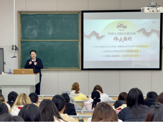 课上,李洋首先分享了自身成长经历,讲述自己在不同的人生阶段是如何受到爱国主义精神的感召与激励,从年少时对历史的初步认知,到深刻领悟抗战胜利对于国家和民族的重大意义。他以自身经历为切入点,拉近了与同学们的距离,让同学们更能感同身受地体会到抗战精神在当代的传承与延续,激发起同学们内心深处的爱国情怀。他还指出,重温抗战历史,不仅仅是对过去的缅怀,更加是要从中汲取前行的力量。李洋结合史实和抗战实例,系统梳理了14年抗战的艰难历程,阐释了中国共产党在抗战中的中流砥柱作用,强调了中国战场作为世界反法西斯战争东方主战场的重要作用。他通过刘老庄连、狼牙山五壮士等英雄事迹,阐述了伟大抗战精神的核心内涵,让同学们在英雄事迹中感受精神力量。