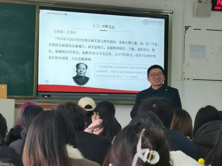 通过图片、多媒体和影像,刘教授展现了川陕苏区、红军长征在四川、三线建设、“两弹一星”科技城等场景,用生动的语言、情感化的表达方式、AI智能技术等引发了广大学生的共鸣,让他们了解认识到红色四川的历史与文化,“两弹一星”精神等所孕育的家国情怀,四川红色文化的价值传递所在。