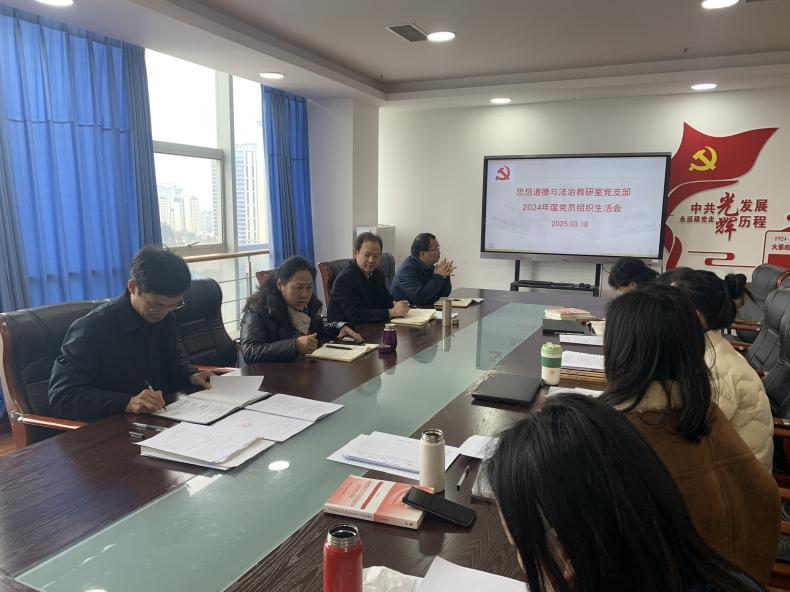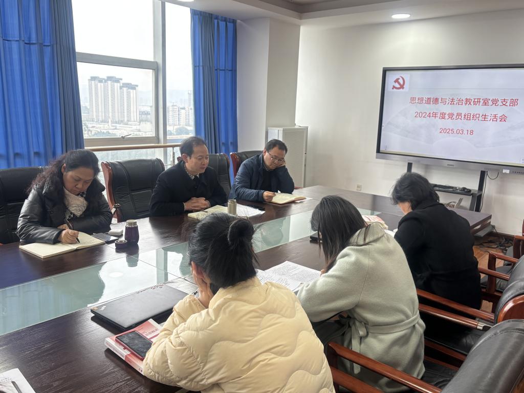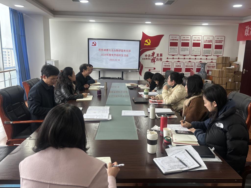 2025年3月18日,思想道德与法治教研室党支部在明德楼813会议室召开2024年度组织生活会和民主评议党员活动。会议由党支部书记欧美强主持,支部全体党员参加。会议聚焦政治纪律、党性锤炼、全面从严治党等核心要求,严肃开展批评与自我批评,查摆问题、凝聚共识,进一步增强党性修养,发挥党支部战斗堡垒作用。