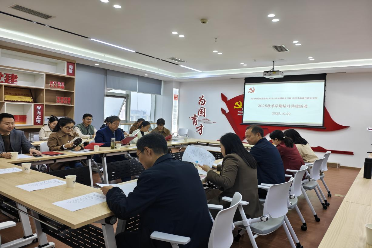 参观结束后,三校围绕党建引领,思政铸魂育人,将红色财经文化融入思政课教学等方面展开交流。四川财经职业学院马院党总支书记李平介绍了特色马院建设基本情况,副院长董文介绍了课程建设、师资队伍、科研等情况。四川文化传媒职业学院马院党支部书记龚成娇、四川华新现代职业学院马院胡东坡院长分别介绍了两校马院师资、教育教学、竞赛等基本情况,与会人员就党建业务融合,提升教育教学质量开展互动交流,希望三校继续加强沟通,深化合作,结对发展。