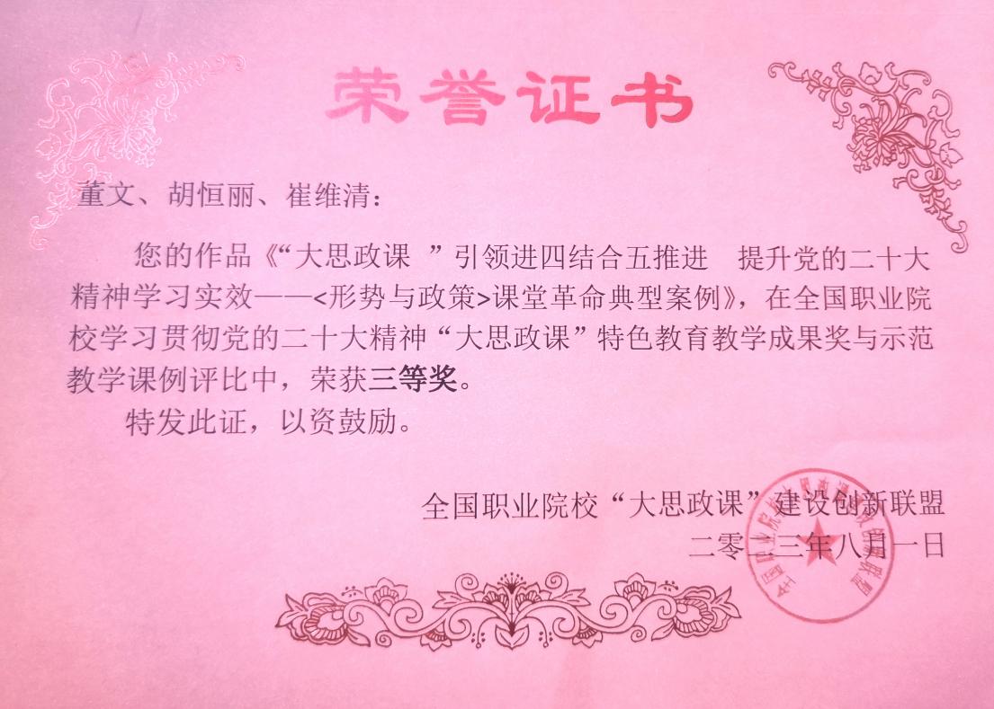 近日,全国职业院校学习贯彻党的二十大精神“大思政课”特色教育教学成果奖与示范教学课例评选结果公示,马克思主义学院董文、胡恒丽、崔维清申报的《“大思政课 ”引领进四结合五推进 提升党的二十大精神学习实效——<形势与政策>课堂革命典型案例》,钟玲、王小伟、黄岑岑、刘秀、林琳申报的《“与爱同行”实践育人项目》均荣获三等奖。