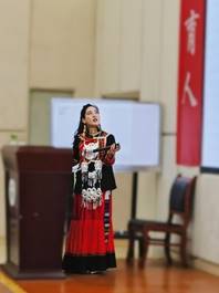 来自22级会计11班的羌族学生桂立袁和张明浩从“牧羊的古羌”对中华文明的深远影响谈到中华民族发展历程中羌族与其他民族的不断交往融合的过程,还向大家介绍了现代羌族的地理分布、人口现状等。当乐音悠悠的羌笛声在整个B213阶梯教室响起,所有人仿佛看到了川西高原岷江上游的崇山峻岭中,拥有坚定意志的羌族人民世代繁衍生息的诗性文化意象。