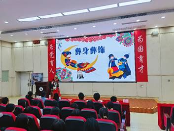23级电商3班的杨慧洋身着苗族传统服饰,带着一顶工艺精美的苗族银饰头帽入场,以“猜猜我来自哪个民族”的巧妙互动开场,瞬间拉近了台上台下的距离,将同学们引入乐山玛瑙苗寨的独特风情中。他从蚩尤大战黄帝讲到今天的非物质文化遗产——苗绣,通过一张张吉光凤羽的服饰图案向大家展示苗族人是如何把历史穿在身上。此外,还向大家介绍了自己作为少数民族学生“与你不同,也与你相同”的成长轨迹。