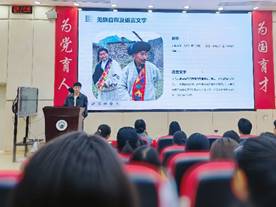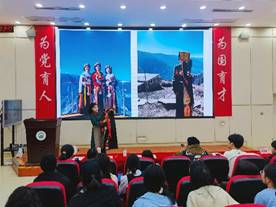 22级会计8班的曲木王友和22级工商3班的罗格克牛分别来自大凉山和小凉山彝族。他们以光彩夺目的彝族盛装出席,先后向大家介绍了彝族的悠久历史和古老文化,包括古彝文、太阳历法、毕摩经书、建筑、服饰、节日、习俗等。同时,还通过红军长征过程中“彝海结盟”伟大事件的讲述,展示了中国共产党从成立之初一以贯之的民族平等团结一家亲的民族政策。