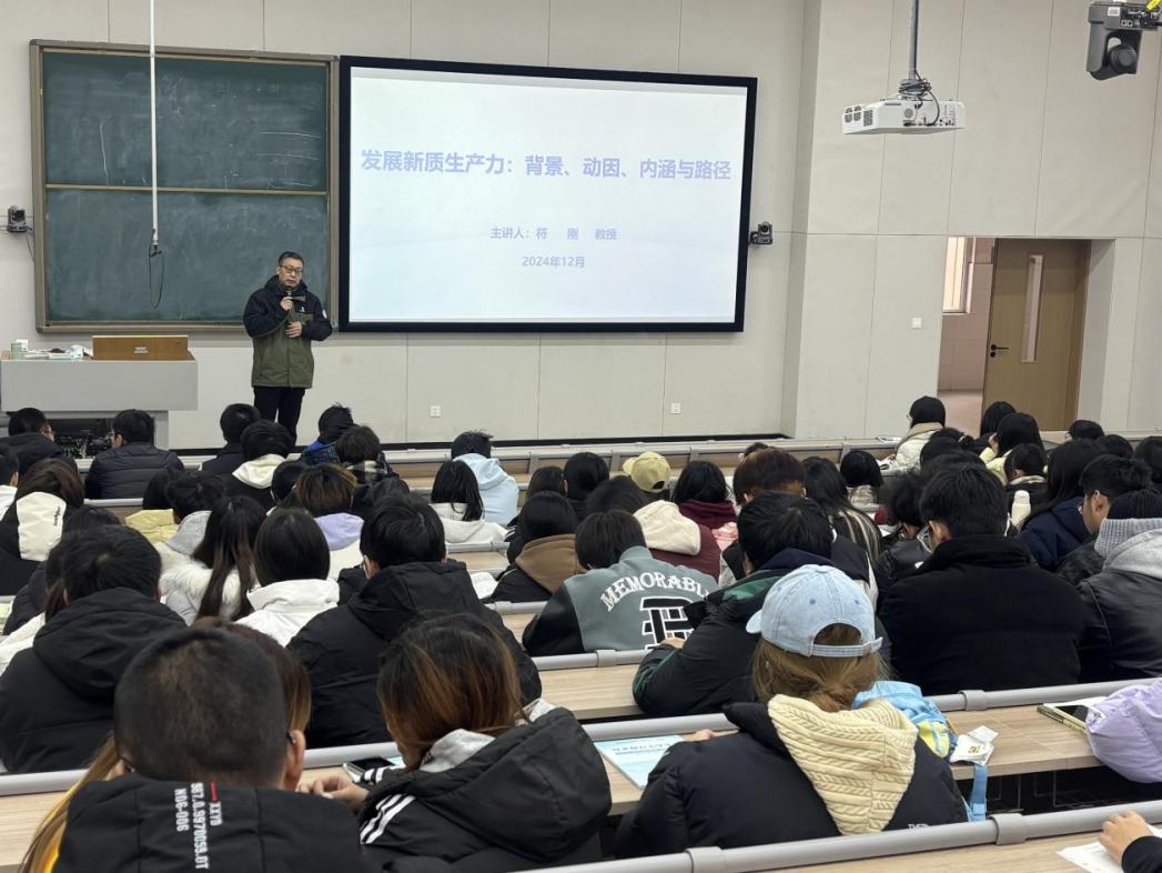 为深入学习贯彻习近平新时代中国特色社会主义思想和党的二十届三中全会精神,推动思政课建设内涵式发展,2024年12月11日学院院长符刚教授以《加快发展新质生产力》为主题,为金融学院2024级金融科技应用1班、2班的同学讲授了一堂精彩的形势与政策课。