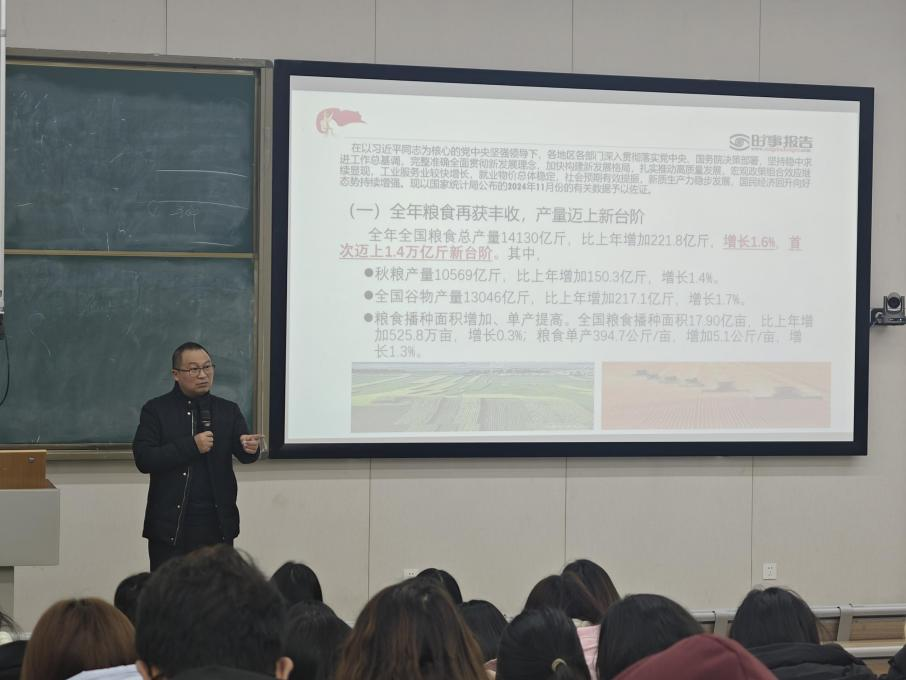 为深入贯彻落实党的二十届三中全会精神和《关于深化新时代学校思想政治理论课改革创新的若干意见》等文件精神,12月 20 日, 学院副院长罗潇教授 走进 2024级金融服务与管理1、2 班的课堂,为学生们带来了一堂精彩的 “形势与政策”课。本次授课以《当前中国的经济形势》为题,罗潇教授从“国内、国际经济形势分析”“重要经济政策解读”和“社会热点经济问题与应对策略”三个方面进行讲授。在授课过程中,罗潇教授紧扣国家发展战略、四川省发展战略,结合我国经济的发展现状和未来前景,结合金融服务与管理专业情况等进行了深入浅出的授课。通过大量贴近学生、贴近生活、贴近实际的案例,深刻阐释了当前中国的经济形势和中国式现代化的战略意义。