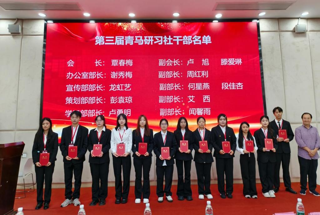 张志副主任为第二届青马研习社12名优秀干部颁发荣誉证书,表彰他们过去一年在社团组织建设、活动策划执行等工作中的突出贡献,激励新一届社团干部以优秀为榜样,接续奋斗。指导教师钟玲宣读第三届青马研习社干部名单,李平书记、廖中强副部长为新任干部颁发聘书。新任研习社会长覃春梅代表新一届社团干部做了发言。