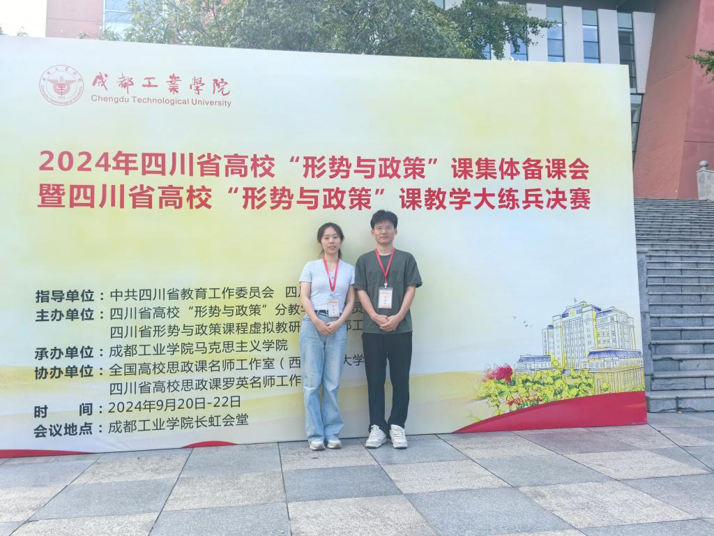 为学习贯彻党的二十届三中全会精神、习近平总书记对学校思政课建设作出的重要指示精神,落实新时代学校思政课建设推进会要求,进一步提升四川省“形势与政策”课教师教学水平,增强教师运用科学理论深刻分析与把握国际国内形势和各项政策的能力,9月21日,四川省高校2024年“形势与政策”课集体备课会暨“形势与政策”课教学大练兵决赛活动在成都工业学院长虹会堂举办,我院刘思语、单立阳老师参会。