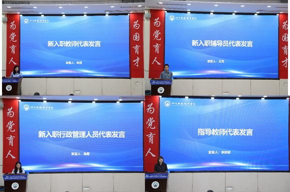 开班仪式上,新入职教师代表林莉、辅导员代表王亮、行政管理人员代表高霞、指导教师代表李妍妍依次发言。