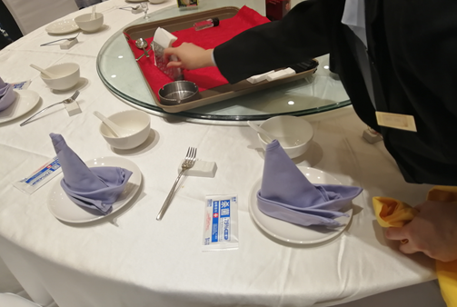 (图为肖琛琛老师学习中式餐桌摆台)