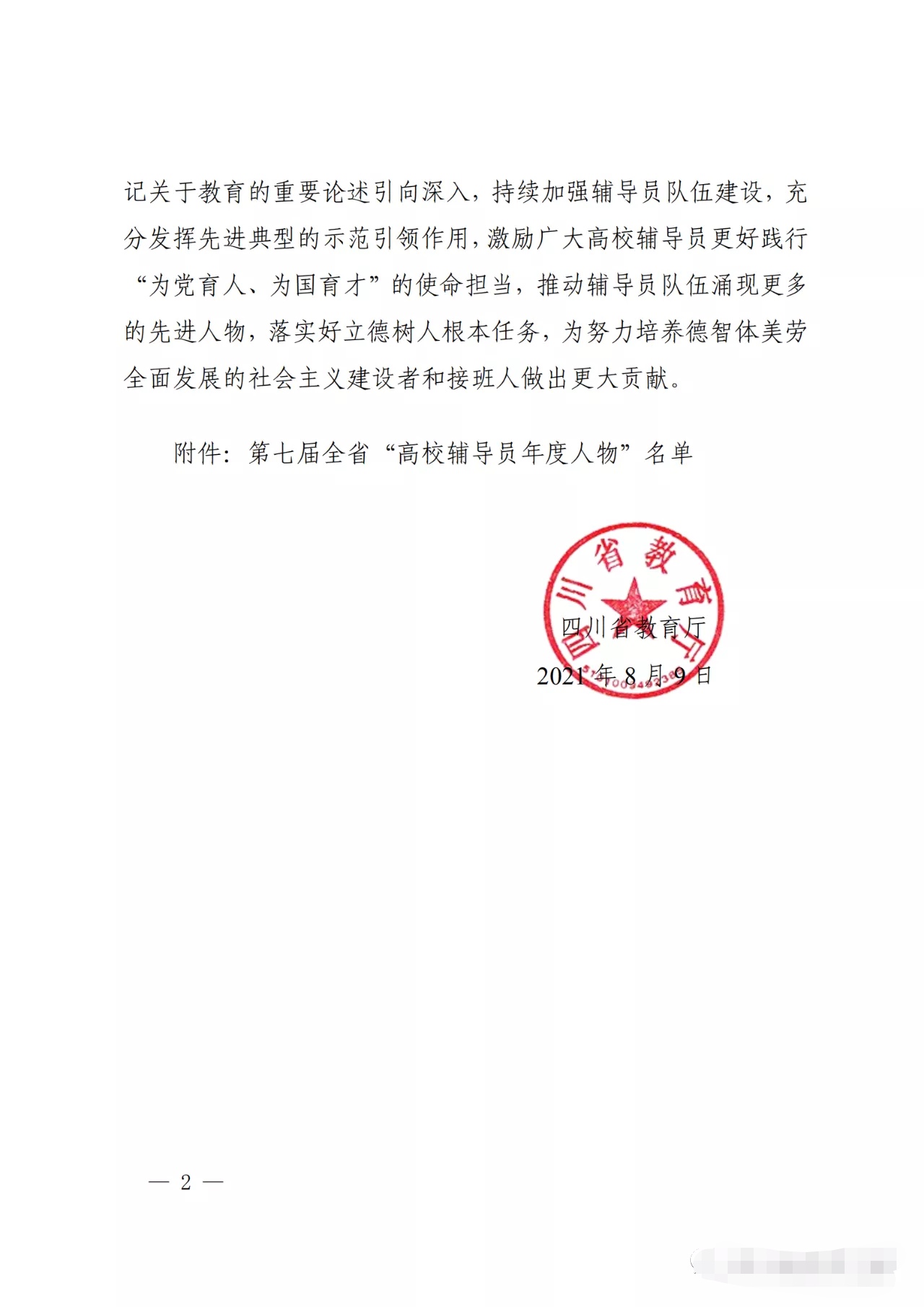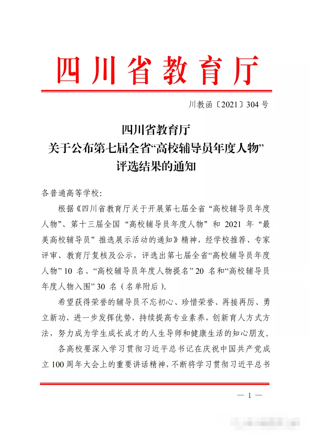 个人多次荣获校级、省级荣誉称号:四川省高等学校名辅导员(2020)、四川省财政厅廉政故事演讲比赛二等奖(2020)、四川省第六届高校辅导员年度人物入围奖(2020)、四川省第六届高校辅导员素质能力大赛三等奖(2018)、7790cnm必发集团教学名师(2020)、优秀辅导员(2014、2017),指导三个学生团队参加第十六届“挑战杯”四川省大学生课外学术科技作品竞赛活动荣获二等奖1项、三等奖2项(2021);指导学生参加“我心中的思政课”四川省高校大学生微电影作品竞赛,荣获二等奖(2021)。