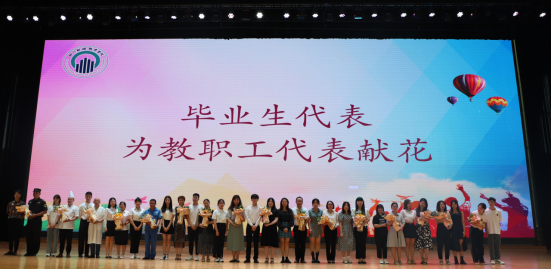 随后,毕业生代表为教职工、行政、后勤、专业教师、辅导员等献上鲜花,表达浓浓的感恩之情。