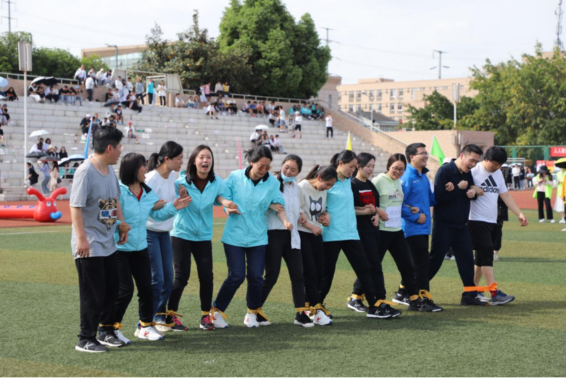 随着迎面接力赛的落幕,激昂的口号声再次响起。此时绿茵场上的老师们将脚绑在了一起齐步并进,这就是今天的教师组团体项目“齐心协力”。老师们步伐整齐、铿锵有力,各组的参赛老师都不甘示弱,全心全意的投入比赛。