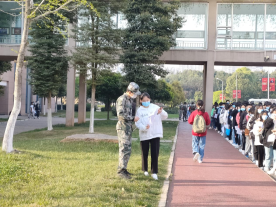 此外,我院严格落实防控措施,扎实做好疫情防控工作,在每个执勤地点设立体温监测处,民兵连同学一一为所有考生测量体温,提醒广大考生注意入校事项,耐心为考生答疑解惑。他们坚守岗位,认真做好证件检录工作,工作中一丝不苟,在发现行动不便的考生时,他们主动伸出援手为其开辟绿色通道,助力考生顺利到达考场。
