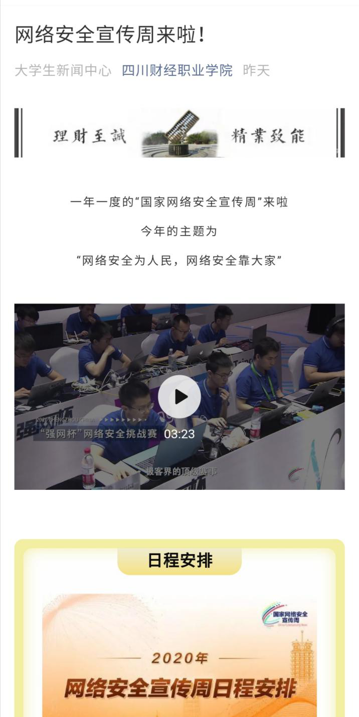 一是学院党委高度重视,党委宣传部认真制定活动方案,及时发布活动通知,组织全院师生参与重点活动,并将网络安全宣传教育有关活动纳入学院秋季学期开学工作统一安排;二是利用学院网站首页开辟专栏链接,动员广大师生认真学习相关网络安全政策和知识;三是学院官微推出以网络安全为主题的推文,分享官方宣传片、宣传周日程安排、习近平主席对网络安全的重要论述及应对网络安全风险的举措;四是组织广大师生于9月15日通过中国大学生在线平台收看网络安全公开课:聚力青春,守护安全;五是分享微信小程序,动员学生积极参加全国大学生网络安全知识竞赛;六是组织全院各班通过主题团日活动、主题班会,采取线上与线下相结合的方式,积极开展网络安全相关活动,进一步学习网络安全相关知识,提高网络安全意识和防护技能;七是学院33个基层党组织,400余名党员干部通过线上线下方式深入学习网络安全知识。