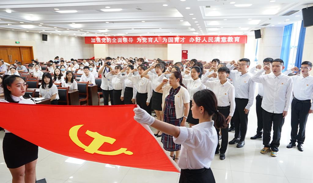 大会伊始,全场起立奏唱中华人民共和国国歌。本年度新发展的学生预备党员在学院党委书记张华同志的领誓下,面对党旗、庄严宣誓,这既是对学生党员爱党、爱国的教育,也是提升其党性修养、牢固树立为人民服务宗旨意识的思想引领。