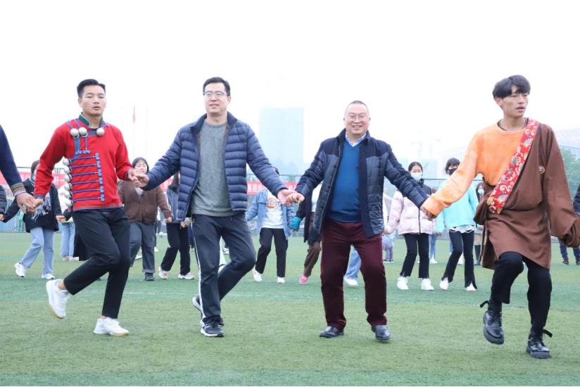 下午微风许许,由社团联合会锅庄舞协会和索玛花协会带来藏族锅庄舞和彝族达体舞。身着艳丽民族服饰的各民族兄弟姐妹们齐聚小足球场踏歌起舞,欢呼跳跃着聚拢在圆形中央,趴着彼此的肩膀,仿佛一颗颗红润饱满的石榴籽;同学们左脚跳跃,右脚抬起自然弯曲,同时双手击掌,动作反复循环;跨步左右自然摆动,男女交错互换位置,变换队形,时而顺时针转动,时而逆时针转动。同学们也热烈邀请学院党委委员、副院长罗潇,工商管理学院党总支书记郑代富,学生工作部副部长(主持工作)刘丹,团委副书记(主持工作)马宁等老师一起感受锅庄舞和达体舞的魅力,充分展示藏族和彝族人民热情豪放的性格。