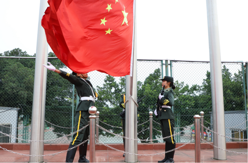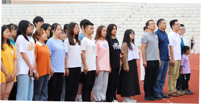 上午八点三十分,升国旗仪式开始。国旗护卫队的同学们迈着整齐的步伐,昂首挺胸走向升旗台。伴随着嘹亮的国歌声,五星红旗冉冉升起。到场师生全体肃立,行注目礼,注视迎风飘扬的五星红旗,无声的向祖国母亲表达深切的祝福。1949年10月1日,第一面中华人民共和国国旗由毛泽东主席在天安门广场首次升起。至今,72年的奋斗征程不断向前,无数国旗飘扬在祖国大江南北和全球各地,中国红永远在国人心中,如果信念有颜色,那一定是中国红。