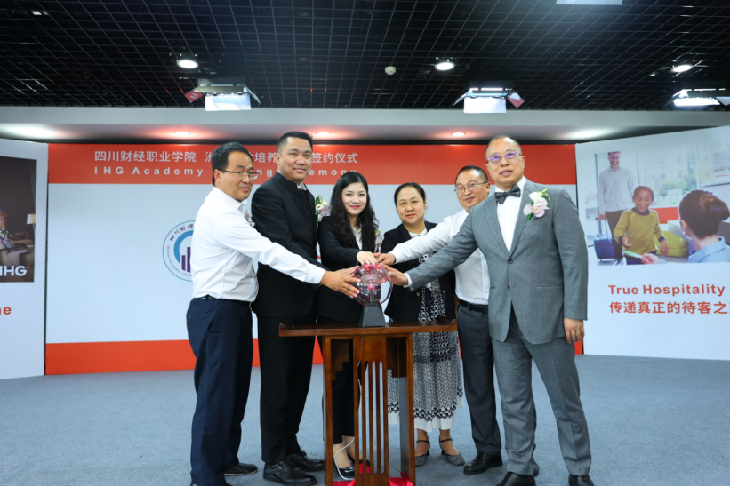 在双方代表的见证下,学院党委委员、副院长罗潇与洲际酒店集团大中华区首席财务及运营支持总监贾真共同签署了合作协议。学院党委书记张华,党委委员、副院长罗潇,党委委员、副院长肖兆飞与洲际酒店集团大中华区首席财务及运营支持总监贾真,四川区域总经理、成都环球中心天堂洲际大饭店总经理林志华,大中华区西区区域财务及业务支持总监姜山一起共同点亮灯球并为此次签约仪式揭牌。