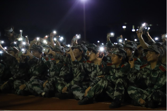 为丰富同学们的军训生活,9月17日晚上7点,组织大家在体育场进行了一次别开生面的军训文艺汇演,以手机闪光灯为荧光棒,同学们纷纷自告奋勇上台进行节目展示表演,动情的歌曲大合唱、精彩的舞姿赢得了阵阵喝彩。