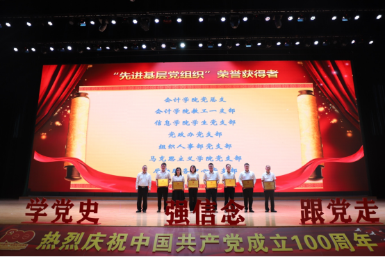 表彰大会结束后,庆祝中国共产党成立100周年主题晚会正式拉开帷幕。在一阵阵掌声中,五个二级学院与大学生艺术团合唱队、学院师生代表、教职工合唱队带来了9个精心准备的的节目,包括舞蹈、合唱、情景剧、快板、诗歌朗诵等,形式多样,内容丰富,为观众呈现了一场丰富的视听盛宴。其中由会计学院带来的情景剧《英雄赞歌》更是将现场气氛推向高潮。先烈们牵制敌人,克服困难,宁死不屈的精神谱写了一首壮丽的史诗,赢得现场观众阵阵掌声。