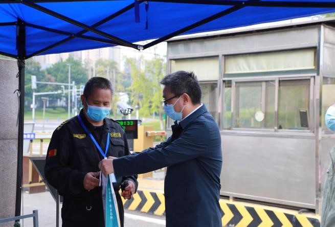 符刚一行分别到学校门卫、学生食堂、干训楼、快递收发点、教学楼长廊核酸检测点及物业管理办公室等地点详细了解疫情防控一线工作人员及留校师生、志愿者工作和生活等基本情况,认真查看疫情防控各项工作落实情况,代表学院党委、行政向大家表示节日慰问。