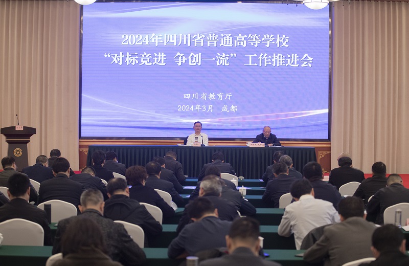 3月18日,2024年四川省普通高等学校“对标竞进、争创一流”工作推进会在成都召开。会议系统梳理总结“对标竞进、争创一流”工作开展以来的经验成绩,分析形势问题,部署相关工作,强调要认真学习贯彻习近平总书记关于教育的重要论述和对四川工作系列重要指示精神,落实省委、省政府关于高等教育的决策部署和2024年四川省教育工作会会议精神,持续开展好“对标竞进、争创一流”工作,奋力推动我省高等教育内涵式高质量发展。省委教育工委副书记,教育厅党组成员陈朝先出席会议并讲话,教育厅一级巡视员戴作安主持会议。