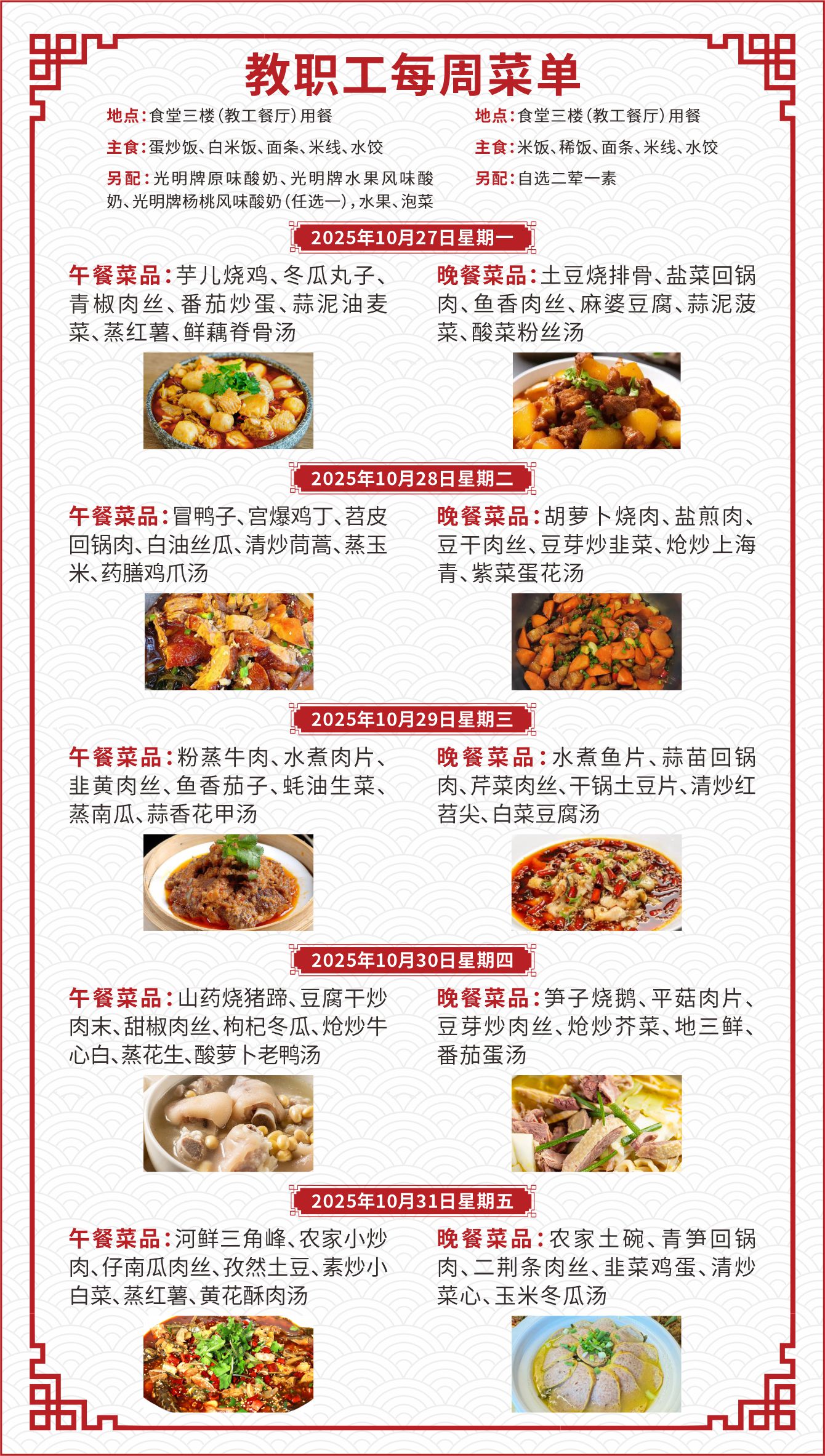 一、如遇就餐人员变化,原材料采购等原因,每日供应菜品以实际呈现为准;