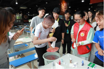 本次活动将传统漆扇的制作作为中国非物质文化遗产体验的拓展。漆扇制作是使用漆艺中的“飘漆”技法,漂漆以水为介、以漆作画,利用了漆不溶于水的特质以点、甩、弹、划等手法,在水面绘出图案效果。同学们作出的漆扇颜色鲜艳、花纹各异、别具一格,令人遐想无限。