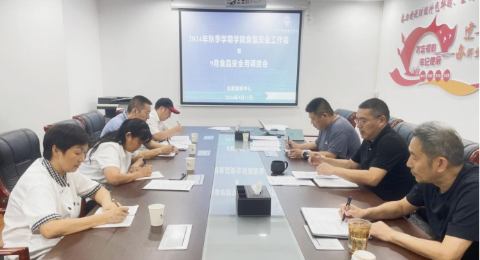 2024年9月29日,后勤服务中心在明德楼1105会议室组织召开了2024年秋季学期学院食品安全工作会暨9月食品安全月调度会。后勤服务中心主任文洁、副主任黄宏斌、膳食及食品安全管理科、学生食堂食品安全总监及食品安全员参加了本次会议。