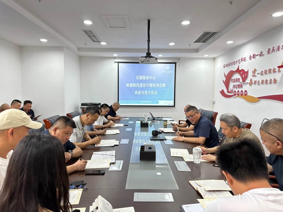 为提升教师思想政治素质和职业道德水平,2025年6月9日,后勤服务中心在明德楼1105会议室组织开展师德师风建设专题培训暨承诺书签字仪式。培训由后勤服务中心主任文洁主持,后勤全体教师参加。